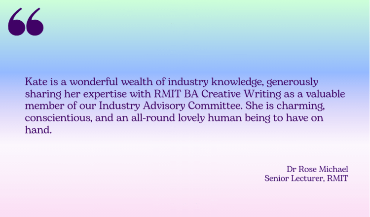 With two higher learning degrees herself, including a PhD, Kate is an experienced and engaged teacher in the tertiary space, able to balance a practical and theoretical understanding of the publishing industry.